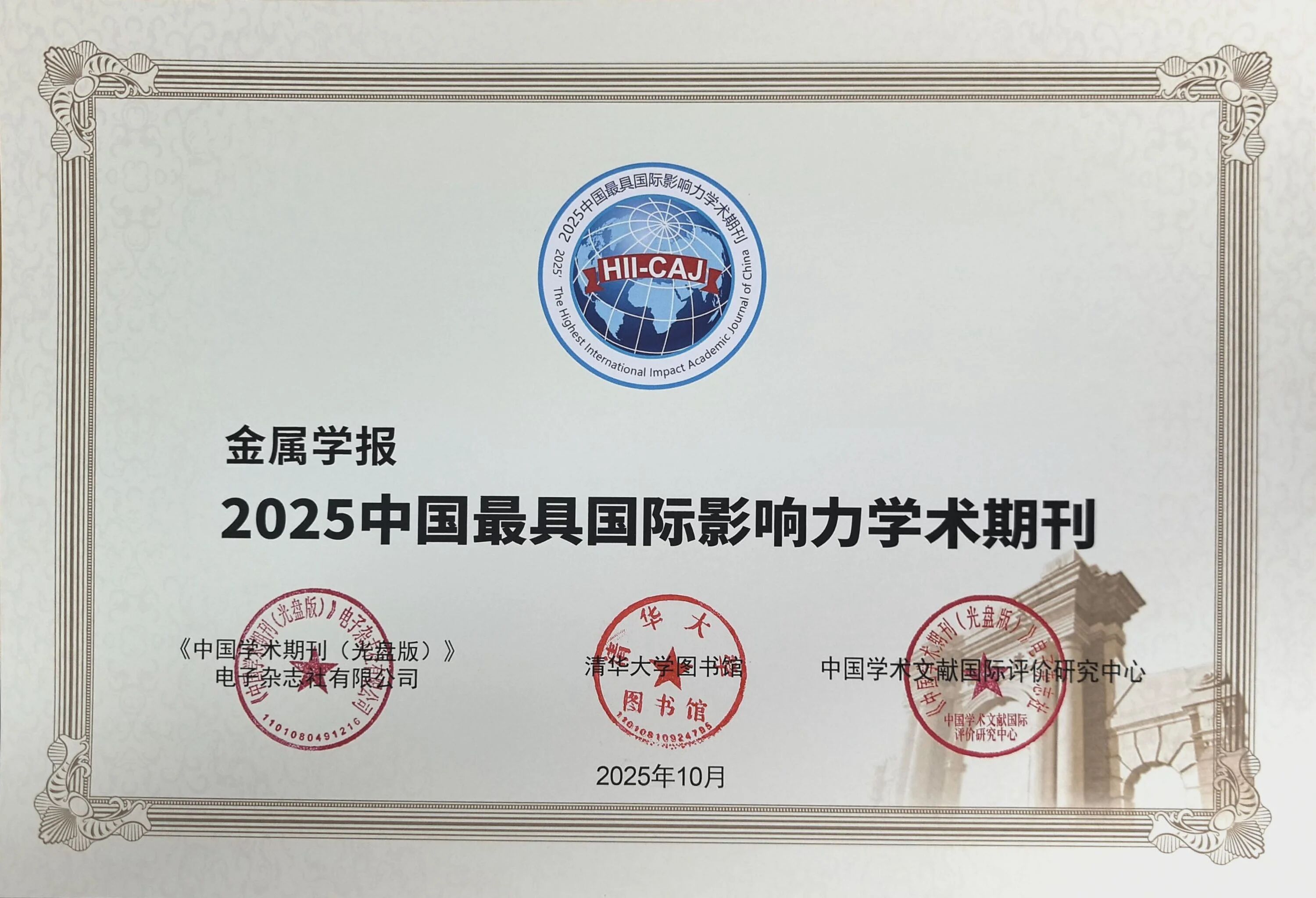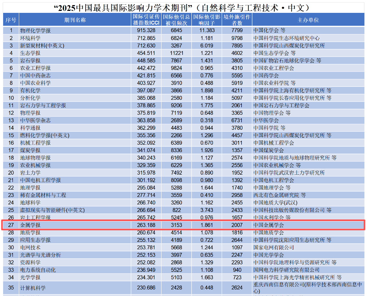 近日,《中国学术期刊国际引证年报》(2025版)正式发布。《金属学报》入选2025年“中国最具国际影响力学术期刊 ”,共有100种中文学术期刊入选“中国最具国际影响力学术期刊 (自然科学与工程技术·中文)。