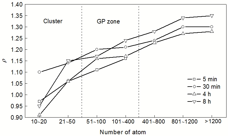 为进一步明确时效过程中析出相成分的变化规律, 对样品中析出物的ρ 进行了分析. 图5为180 ℃时效不同时间后Al-Mg-Si合金中溶质原子团簇、GP区和 β" 相的ρ 的变化. 可以看出, 在180 ℃时效, 对相同时效时间, 样品中析出物的ρ 随原子数的增大逐渐升高; 对不同时效时间, 相同类型的析出物的ρ 值基本一致. 时效5 min的样品中, 溶质原子团簇中的ρ 在1.0左右, GP区中的ρ 在1.11~1.16之间. 时效至4 h, 样品中析出物的ρ 在0.91~1.28之间, 其中, 较小的 β" 相(原子数为401~800)中的ρ 为1.23, 较大的 β" 相(原子数>1200)中的ρ 为1.28, 但 β" 相中的ρ 为1.26, 这与Al-7Si-0.3Mg合金峰值时效时的ρ 相似, β" 相中ρ 在1.2左右[25 ] . 时效8 h后, 样品析出物中的ρ 在0.95~1.35之间, 较大的 β" 相的ρ 为1.35, 这比文献[25]报道 β' 相中的r >1.7的要小.