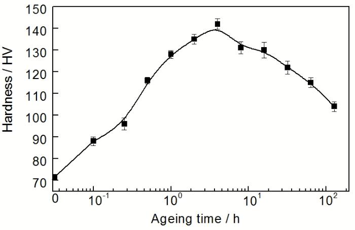 图1是Al-Mg-Si合金经550 ℃固溶1 h后水淬, 再在180 ℃直接人工时效的硬度变化曲线. 可以看出, 合金存在明显的时效硬化效应. 样品经550 ℃固溶1 h后, 硬度只有71 HV, 但在180 ℃直接人工时效后, 样品的硬度在短时间内迅速增加, 时效0.5 h时样品的硬度即达116 HV, 时效4 h后到达硬度峰值, 为142 HV. 随后, 出现一个硬度平台, 直到时效16 h后, 样品的硬度开始显著下降, 当时效128 h时, 样品的硬度降低至104 HV.