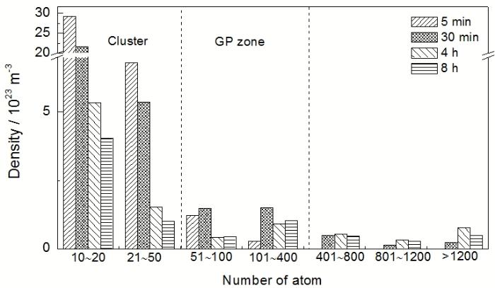 图4为180 ℃时效不同时间后Al-Mg-Si合金中析出物的数量密度分布图. 从图中看出, 随着时效时间的增加, 样品中不同类型析出物的数量密度发生显著的变化. 时效5 min后, 合金中不仅有高密度的溶质原子团簇(36.1×1023 m-3 ), 还有高密度的球状GP区(1.48×1023 m-3 ). 时效30 min后, 溶质原子团簇的数量密度有所减少, 但GP区的数量密度达到最大, 为2.98×1023 m-3 , 也析出少量的针状 β" 相 (0.84×1023 m-3 ). 时效至4 h后, 溶质原子团簇和GP区的数量密度分别下降到6.87×1023 m-3 和1.34×1023 m-3 , 而 β" 相的数量密度达到最大, 为1.61×1023 m-3 , 其中大的 β" 相(原子数>1200)数量密度达0.77×1023 m-3 , 此时样品的硬度也最大. 进一步延长时效时间, 溶质原子团簇和GP区的数量密度下降相对缓慢, 大的 β" 相的数量密度也有所下降. 时效至8 h后, 溶质原子团簇和GP区数量密度分别下降到5.03×1023 m-3 和1.46×1023 m-3 , 而大的 β" 相数量密度下降至0.48×1023 m-3 .