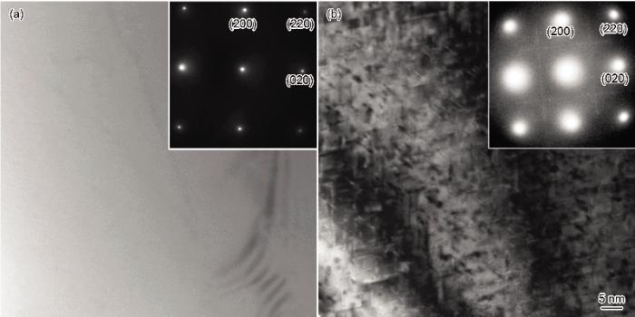 ... 图2为Al-Mg-Si合金经550 ℃固溶后, 在180 ℃时效不同时间的TEM像及相应的选区电子衍射花样(SAED). 可以看出, 在时效5 min时, 基体内未观察到明显的第二相 (图2a), 衍射花样中只有1套衍射斑点存在, 说明此时样品中并不存在明显的析出相. 在TEM模式下, 无法观察到溶质原子团簇和GP区. 时效至4 h, 即峰值硬度条件下, 样品中可观察到2种形状的析出相, 一种是长度约为25 nm的针状 β" 相, 另一种是直径为3~5 nm的颗粒状析出相, 在这些颗粒状析出相中, 有一部分可能是针状 β" 相的横截面, 另一部分可能为GP区[5 ] . β" 相在[001]Al 的衍射谱中形成清晰可见的十字亮纹, 沿着Al的<001>方向生长. ...