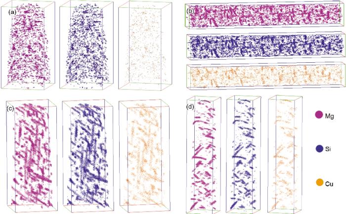 图3为Al-Mg-Si合金在550 ℃固溶1 h后, 再在180 ℃直接人工时效不同时间后Mg, Si, Cu的三维空间分布图. 可以看出, 时效5 min的样品中形成大量的溶质原子团簇和球状GP区(图3a). 时效30 min样品中的溶质原子团簇和GP区有所减少, 但是有少量针状的 β" 相产生(图3b). 时效至4 h, 即峰值时效时, 样品内溶质原子团簇和GP区基本消失, 但存在大量的针状的 β" 相(图3c). 当进一步时效至8 h后, 样品内 β" 相的尺寸更大, 但数量有所减少(图3d).