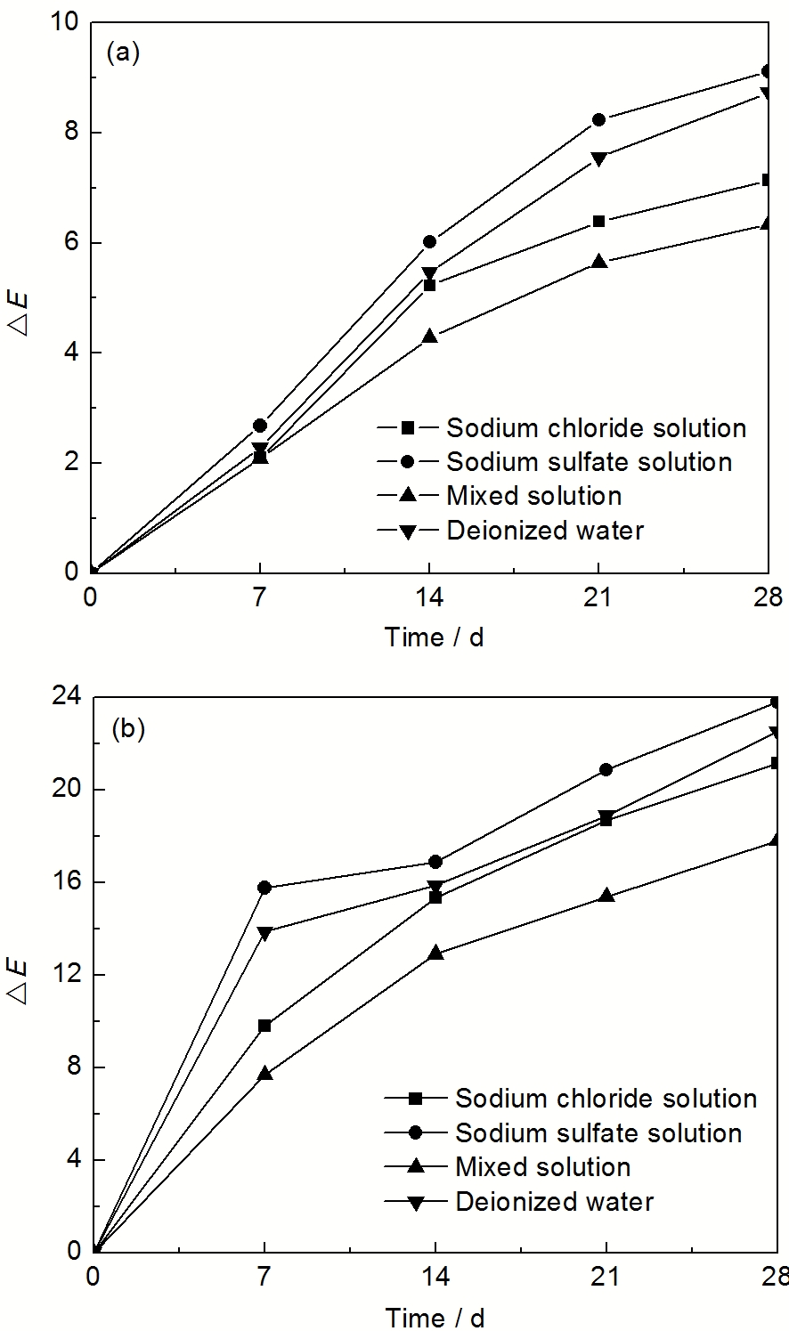 每隔一周从4种腐蚀介质中取相同量的少量样品,用去离子水清洗,除去可溶性的氯化钠或硫酸钠,在30℃的烘箱中干燥24 h,然后将样品在白纸上铺平、压实,采用JZ-300型色差仪测量L,a,b值,每组样品测3次,取平均值。根据△E=[(L-L)+(a-a)+(b-b)]0.5计算老化过程中试样的颜色变化,其中,△E表示色差,色差越大,表示颜色变化越明显;L,a,b表示某时刻的颜色空间坐标;L,a,b表示实验前试样的颜色空间坐标。采用JZ-300型通用色差仪研究铅丹在腐蚀环境中随着腐蚀时间延长而变色的程度。