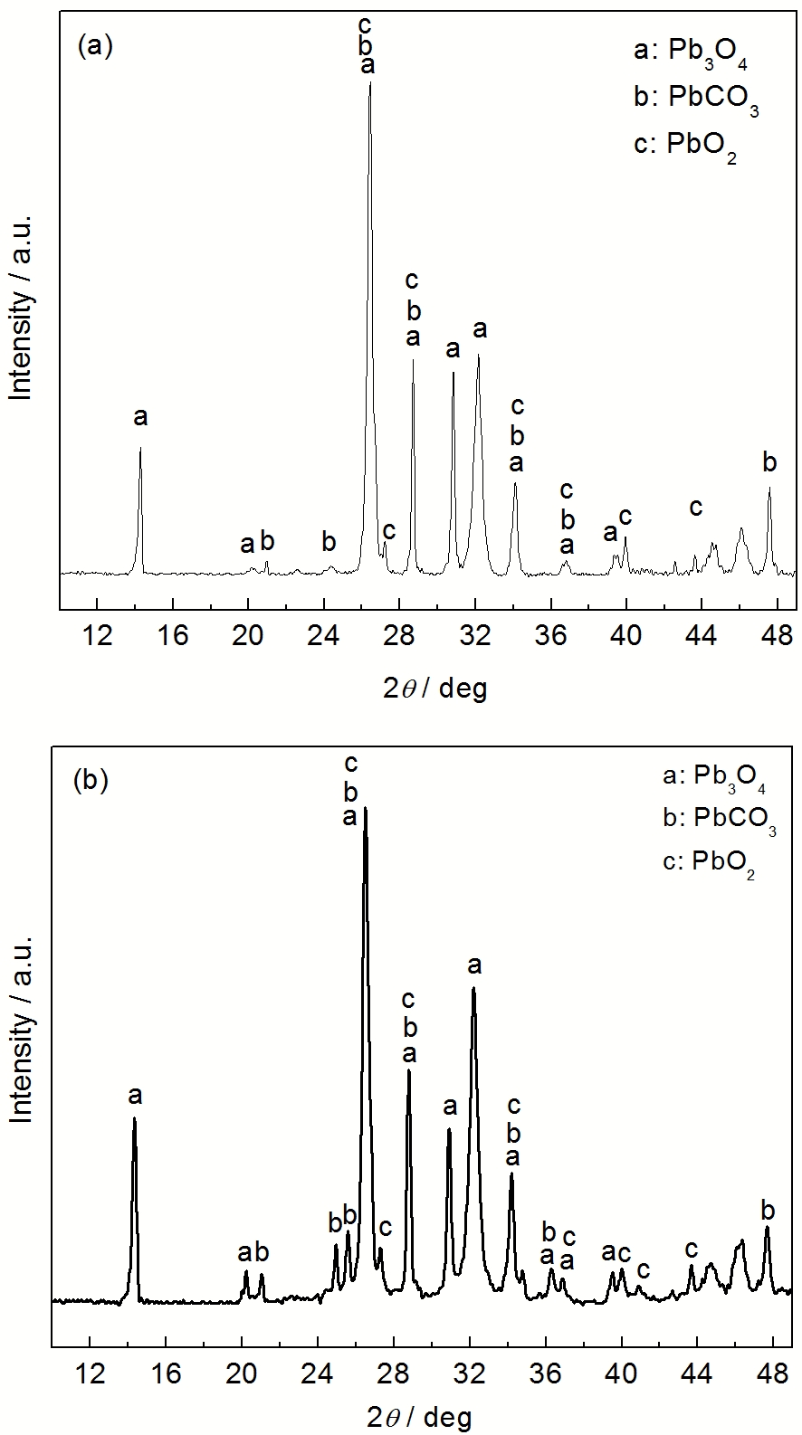 在25 ℃下,将铅丹分别浸泡在NaCl,Na2SO4,混合盐溶液以及去离子水中,并对暴露在空气中的CO2及通入自制CO2的结果进行比较。颜色空间坐标L,a,b的变化结果表明,铅丹在Na2SO4溶液中变色最明显,其次是在水中,再次是在NaCl溶液中,变色最不明显的是在混合盐溶液中。且通入CO2时铅丹的变色速率明显高于不通入CO2时,28 d后色差数值最大相差超过2倍。XRD分析结果表明,无论是否通入CO2,铅丹经浸泡后的组成都由Pb3O4转变为PbCO3和PbO2。