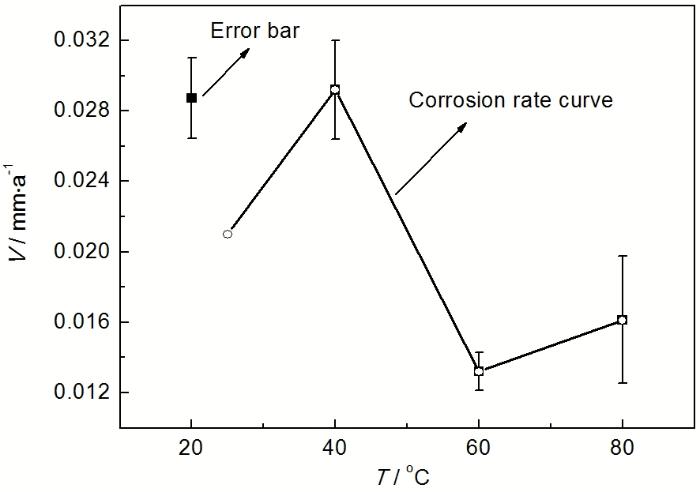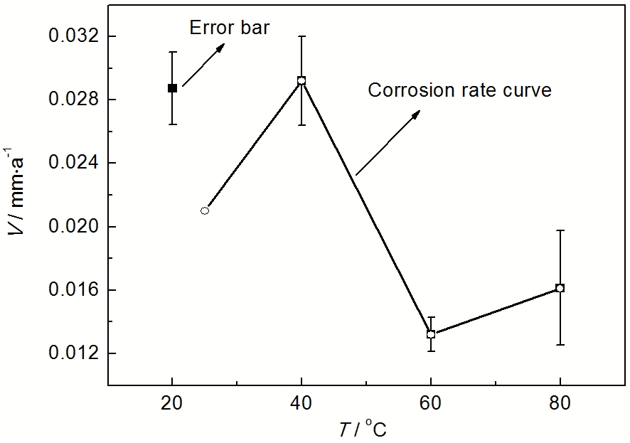 Fig.1 Variation of mass loss rate of X60 pipeline steel with temperature with corrosion rate curve and error bar