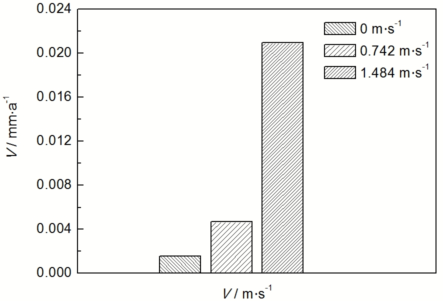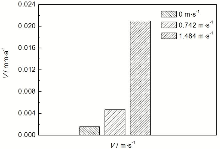3.2.1 腐蚀失重 图5为在含S量0.264%、室温、不同流速下的X60管线钢腐蚀速率曲线。从图5可以看出,在实验条件范围内,整体上随着流速的提高,X60管线钢在原油中的腐蚀速率也随之增大。从数值上看,在流速为1.484 m/s时,X60管线钢的腐蚀速率为0.021 mm/a,相对于0.742 m/s时的腐蚀速率都高出5倍,比静态时高出一个数量级。由此可见,流速对原油腐蚀性的影响性很大。