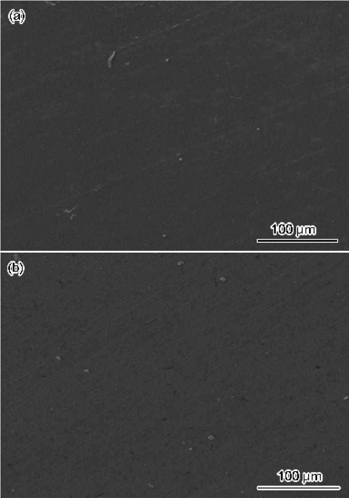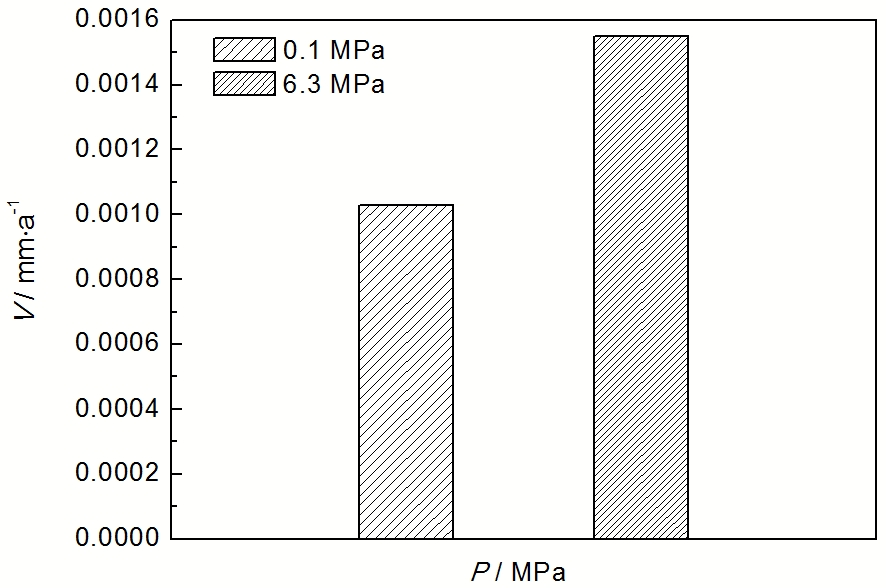 图9为S含量0.264%,不同压力下X60管线钢的腐蚀速率曲线。可以看出,输油管线压力的变化对含硫原油腐蚀性的影响较小。在常压和高压下表现出的腐蚀速率相差不大,X60钢几乎表现为无腐蚀。通过其腐蚀后的微观形貌 (图10) 也可以看出,不同压力下X60管线钢的腐蚀程度基本没有发生变化,试样表面没有明显的腐蚀坑和腐蚀产物吸附,表现出均匀腐蚀。