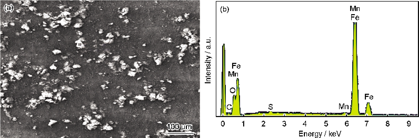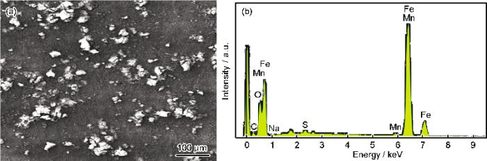 Fig.7 Face scan SEM image (a) and EDS pattern (b) of corrosion scale on X60 pipeline steel at 1.484 m/s
