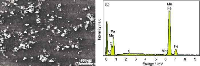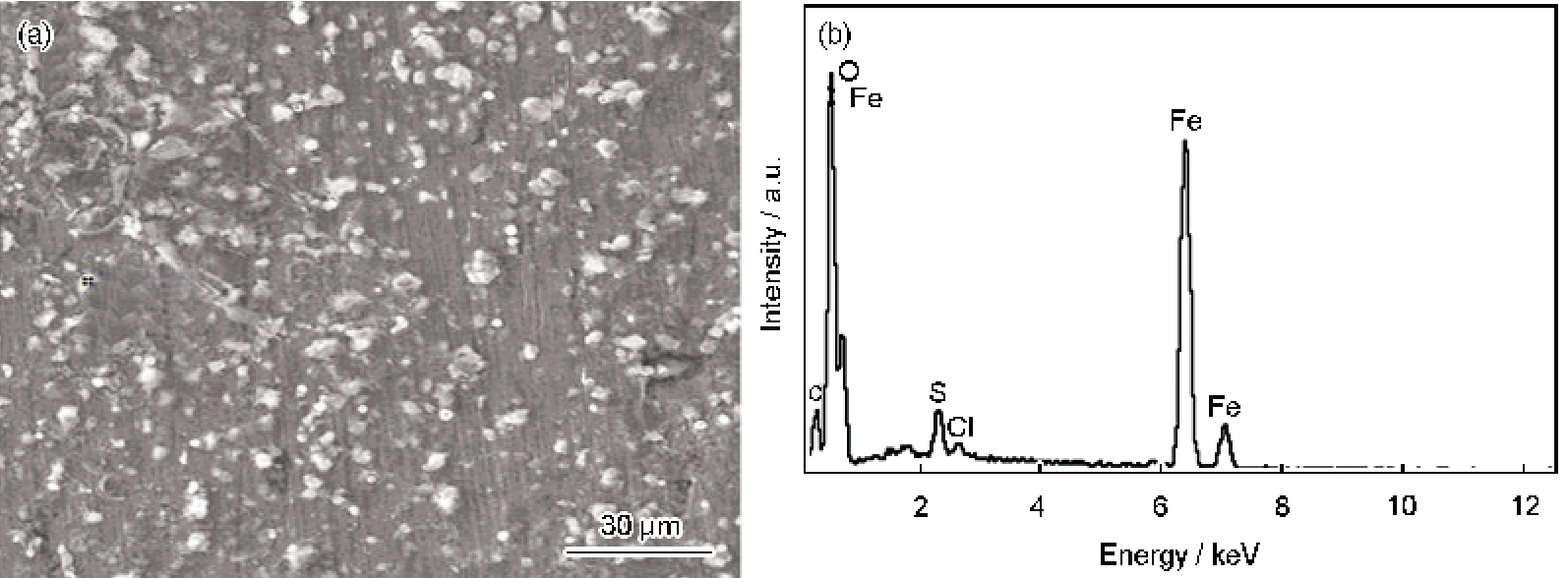 Fig.8 Spot scan SEM image (a) and EDS pattern (b) of corrosion scale on X60 pipeline steel at 1.484 m/s