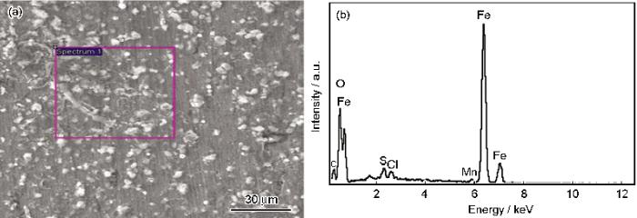 Fig.3 Face scan SEM image (a) and EDS pattern (b) of corrosion scale on X60 pipeline steel at 40 ℃