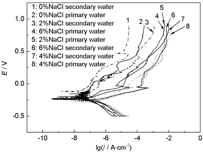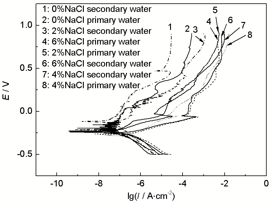 图1为254SMo钢在不同ω一次水和二次水中的极化曲线。由图可知,试样在腐蚀电位下处于活化状态,不论是一次水还是二次水,极化曲线的活化区随着NaCl含量的增加而变窄,并随电位的升高进入钝化区。当ω为0%和2%时,对应的极化曲线未出现明显的钝化区;当ω为4%和6%时,钝化区逐渐明显。值得注意的是,电极电位从腐蚀电位上升进入到稳定钝化区之前,所有的极化曲线上均出现了一个阳极电流峰:阳极活性溶解峰,其所对应的致钝电流密度 (Ib) 和致钝电位 (Eb)[
