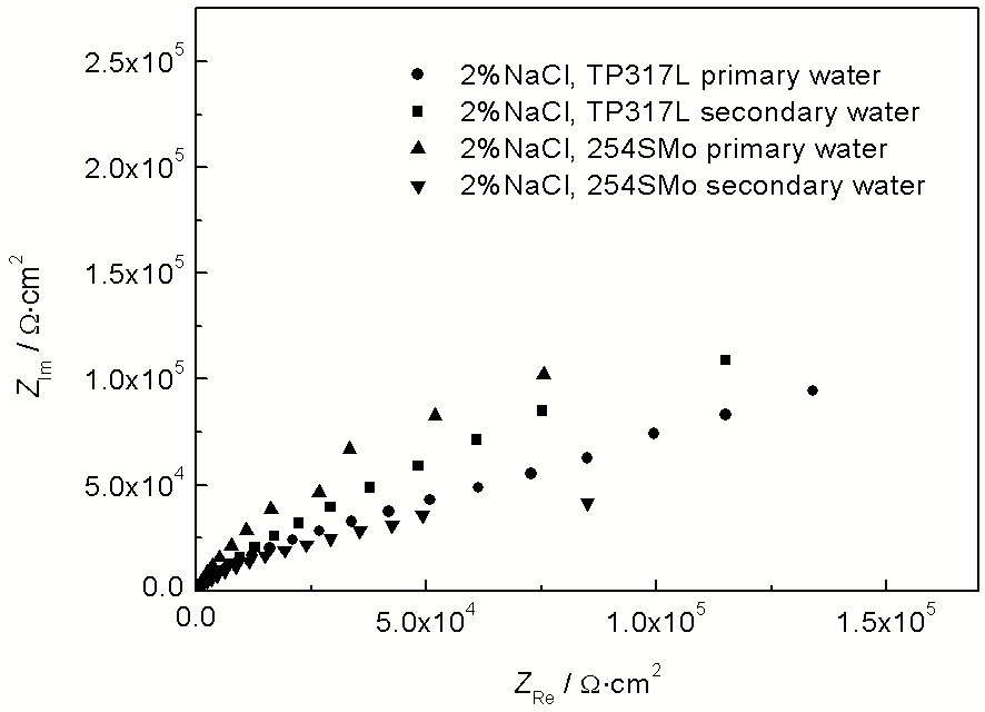图4为TP317L和254SMo钢在ω=2%中水溶液中腐蚀时所测得的电化学阻抗谱 (EIS) 结果。由图可见,ω=2%时,中水一次水和二次水的Nyquist图均显示出圆弧状,因弥散作用增强,曲线随腐蚀进行而逐渐偏向实轴。图谱中254SMo钢在一、二次中水溶液中的容抗弧半径均较大,而TP317L在一、二次中水溶液中的容抗弧半径都较小,说明后者的阻抗模值|Z|较小,表明试样表面钝化膜电阻减小。因此,254SMo钢在一、二次水环境中的耐蚀性能要优于TP317L钢。