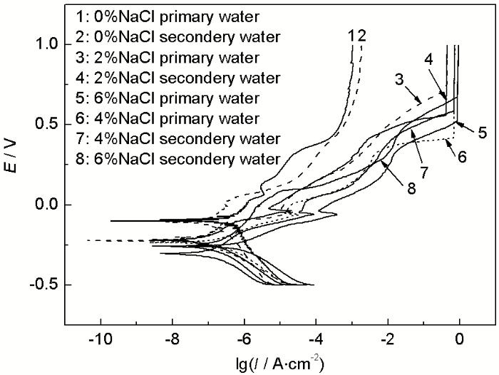 在本文将加入不同质量分数的ω (NaCl) 的中水原水定义为一次水;将一次水经过一次电化学测试后,对其进行过滤,再进行第二次电化学测试的中水定义为二次水。本文之所以利用经过一次电化学测试后过滤得到的二次水进行第二次电化学测试,原因是:一次水经过电化学实验后,水溶液中会含有一些溶解的铁离子或其他金属离子,致使水中的离子浓度增大,水质也会跟着发生变化。这与电厂循环冷却水在一定的浓缩倍率下运行的实际环境是相似的。通过一、二次电化学测试,可以更好地研究与实际运行环境相符合的不锈钢的腐蚀行为,从而为电厂凝汽器的选材提供更有价值的实验依据。