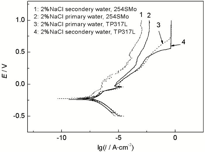 (2) 相同造纸中水水质条件下,TP317L在造纸中水一次水中的耐蚀性能较二次水好,254SMo则相反。