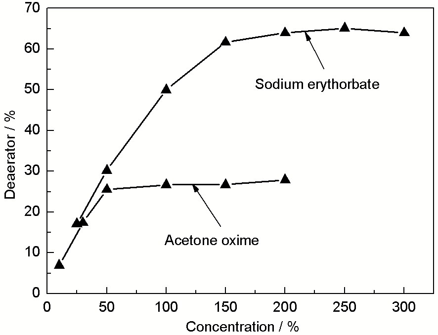 当丙酮肟浓度较低时,其除氧率随着浓度的增加而提高,当其浓度为50 mg/L,除氧率为25.58%,当浓度增加到200 mg/L,除氧率仅上升至27.91%,丙酮肟浓度为200 mg/L时的除氧率还不及异抗坏血酸钠浓度为50 mg/L时的除氧率。可见,丙酮肟具有一定的除氧性能,但其除氧性能远不如异抗坏血酸钠的除氧效果好。