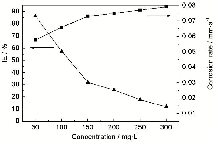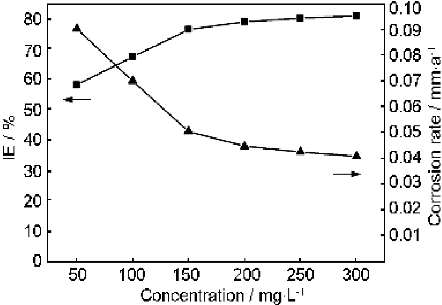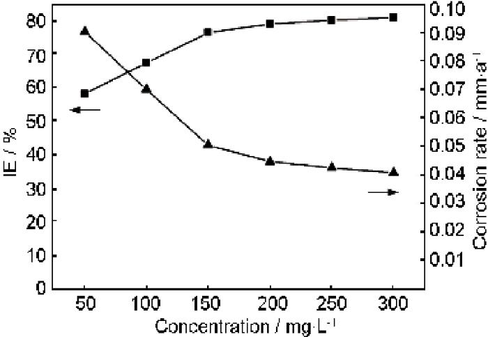 3.4.2 复合缓蚀剂对碳钢的缓蚀性能实验 根据最佳配比配制一定浓度的复合缓蚀剂,实验条件同上,结果如图6所示。可以看出,缓蚀效果随着药剂浓度的增大而提高,浓度为50 mg/L时,缓蚀率为66.95%,腐蚀率为0.0732 mm/a,浓度为100 mg/L时,其缓蚀率和腐蚀率分别为77.23%和0.0504 mm/a,此时的缓蚀效果与相同条件下异抗坏血酸钠浓度为150 mg/L时的缓蚀效果相当;当浓度达到150 mg/L时,缓蚀率为86.31%,腐蚀率仅为0.0303 mm/a,之后缓蚀效果变化的比较缓慢,由此可知,复合缓蚀剂在软化水中对碳钢具有较好的缓蚀效果,其缓蚀效果优于单体药剂。其原因为异抗坏血酸钠是一种高效除氧剂、金属钝化剂,同时还是一种阳极型缓蚀剂,使阳极极化增大,降低了阳极反应的速度;六偏磷酸钠是一类阴极型缓蚀剂,使阴极极化增大,降低了阴极反应的速度;葡萄糖酸钠是一种含有多个羟基和羧基的吸附膜型缓蚀剂,其吸附膜比较稳定,具有较好的缓蚀效果;锌盐能够弥补六偏磷酸钠、葡萄糖酸钠成膜慢的缺点,增强复合缓蚀剂的缓蚀效果[