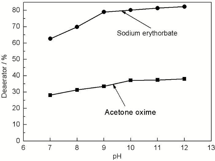 3.3.2 pH值对除氧剂除氧性能的影响 实验研究了不同pH条件下异抗坏血酸钠、丙酮肟的除氧性能,药剂投加量为上述所得最佳投加量,反应时间为30 min,温度为40 ℃,用氨水调节溶液的pH值使其变化范围为7~12。结果如图3所示。可以看出,在投药量一定时,一定范围内两种药剂的除氧率均随着pH值的增大而提高,当pH值为10时,异抗坏血酸钠的除氧率达到了80.24%;此时,丙酮肟除氧效果不是很理想,其除氧率仅为37.15%,之后两种药剂的除氧率随着pH值的增大基本保持不变。可见,异抗坏血酸钠的除氧率受pH值的影响较大,增大pH值可以使其除氧率有很大的提高,其原因为增大pH值时,OH-在金属表面形成保护膜,从而减缓了O的腐蚀,使得更多的O能够与除氧剂发生氧化还原反应,因此除氧率有所高;且异抗坏血酸钠的除氧效果远高于丙酮肟。