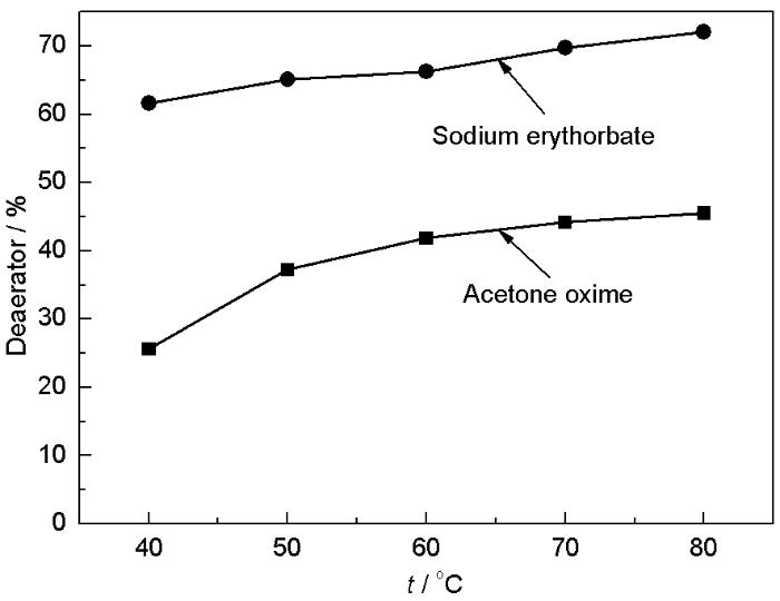 异抗坏血酸钠和丙酮肟的除氧率均随着温度的升高而增加,其原因为升高温度提高了反应的活化能分子数,除氧率必然有一定的提高;同时随着温度的升高,氧的扩散速率也会增大,反应速度加快,使得药剂与氧很快反应完全,即达到一定温度后,除氧率基本保持稳定。