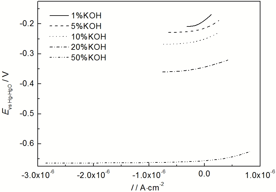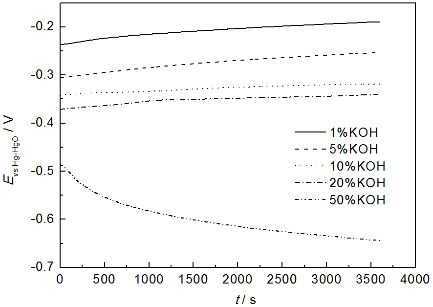 图1 16MnR低合金钢在不同浓度KOH溶液中的自腐蚀电位曲线