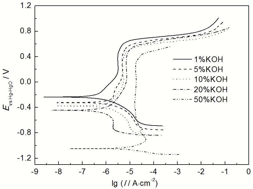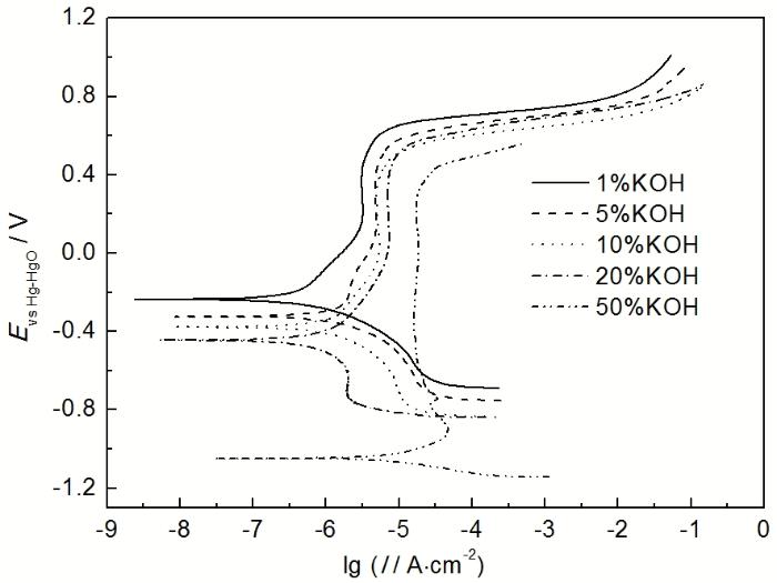 Fig.3 Potentiodynamic polarization curves for 16MnR in KOH solution with different concentrations