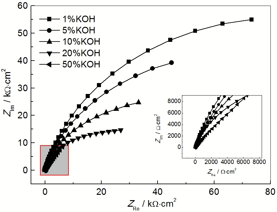 图4 16MnR低合金钢在不同浓度KOH溶液中的Nyquist图