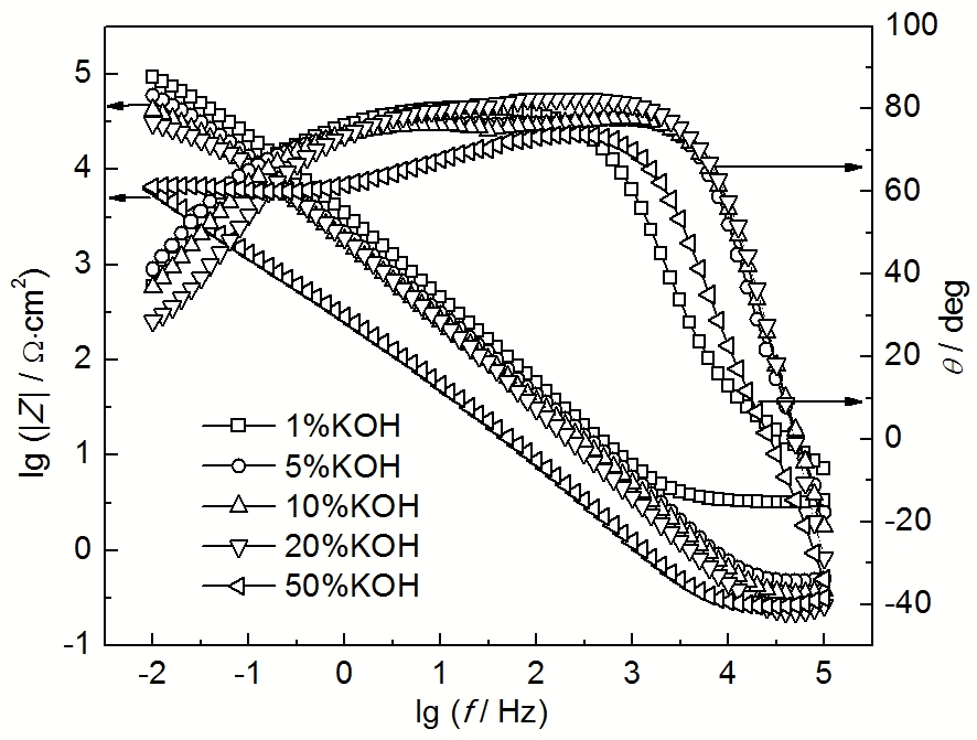 3.2.2 Bode图分析 16MnR低合金钢在不同KOH浓度下的Bode图如图6所示。可以看出,在低频阶段,不同浓度KOH溶液中阻抗值差别较大,1%KOH溶液中的阻抗值比其他浓度下的溶液阻抗值都大,这可能是由两方面的原因造成的:一是因为在KOH浓度较低时,溶液的电阻很大;二是因为OH-对氧化膜的破坏较小,氧化膜相对较完整。然而,在高频阶段阻抗值变化不大,这也说明系统的电容特性明显,氧化膜相对比较完整,使其耐蚀性较高。在中频阶段,lg|Z|-lgf近似为一条45°角的斜线,这表明质量传递控制着腐蚀的过程[18],进一步说明了氧化膜比较完整,可以抑制腐蚀离子在氧化膜中的快速渗透。另外,从图6还可以看出,不同浓度KOH下的斜线起始位置不同,KOH浓度为1%~20%时的起始位置相近,起始阻抗值在100 KΩcm2左右,这与50%的阻抗起始位置 (≈10 KΩcm2) 相差较大。这可能是因为高浓度的KOH溶液中OH-离子较易渗透到氧化膜中去,使得腐蚀加剧。在低频区,lg|Z|-lgf的斜率稍微有所下降,主要是由于在频率变化较慢时,扩散会起到一定的作用,会有部分OH-在氧化膜两端电势差的作用下,缓慢迁移,从而破坏氧化膜。