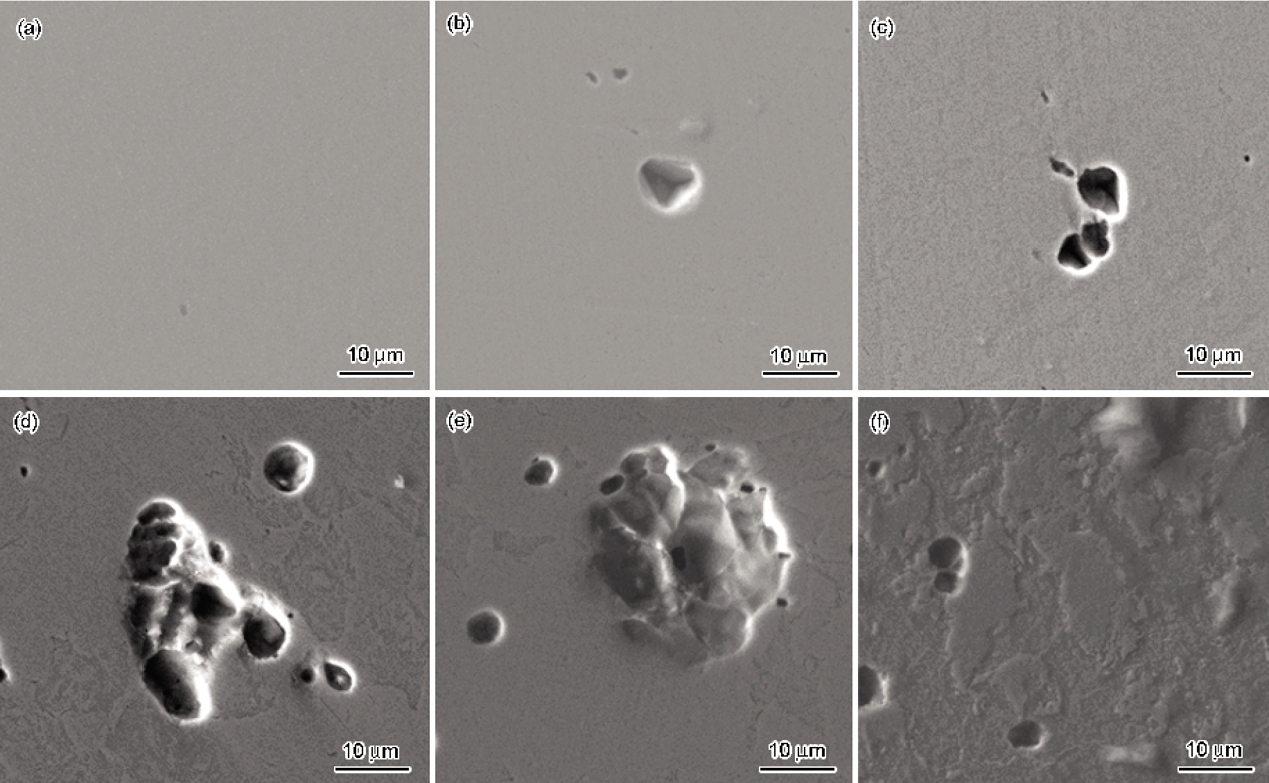 Fig.7 SEM images of 16MnR before (a) and after immersion for 240 h in 1% (b), 5% (c), 10% (d), 20% (e) and 50% (f) KOH solutions with different concentrations