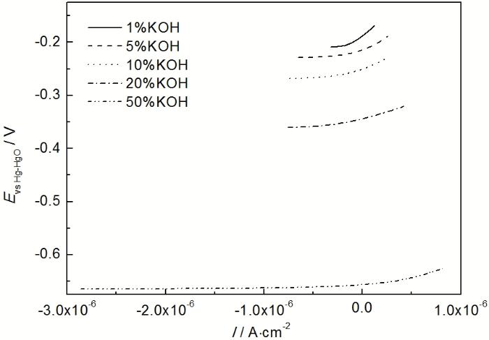 实验在室温下进行,电化学测试在Gamry Interface 1000型电化学工作站上进行。采用三电极体系,待测试样为工作电极,辅助电极为大面积铂片电极,参比电极为Hg/HgO电极 (本文中未作特殊说明的电位均为相对于Hg/HgO电极的电位值)。在1%,5%,10%,20%和50% 5种不同浓度的KOH溶液中进行稳定自腐蚀电位Eoc(1 h)、线性极化曲线 (±0.02 V(vsEoc),0.166 mV/s)、电化学阻抗 (10-2~105 Hz,(vsEoc)) 和动电位极化曲线(-0.5~1.2 V(vsEoc)0.5 mV/s) 等测试。各组实验条件下的平行试样均为3~5个,以保证实验数据的可靠性。