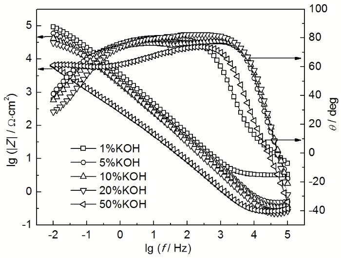 Fig.6 Bode diagrams for 16MnR steel in KOH solution with different concentrations