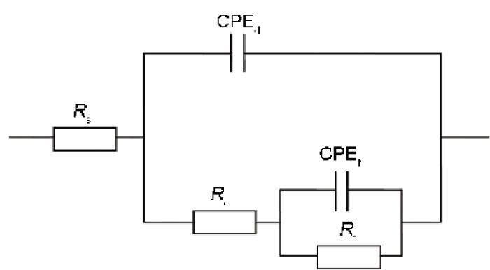 为了清晰地说明电化学阻抗谱所反映的信息,选用图5所示的等效电路进行拟合,拟合结果与实验结果吻合良好。其中,Rs是溶液电阻,Rct是电极反应的电荷转移电阻,Rf为腐蚀产物膜的电阻。由于实验采用固体电极,双电层阻抗行为常呈现弥散效应,这主要是由于腐蚀产物随着反应的进行逐渐在电极表面堆积,破坏了电极表面的均一性,电极表面电场分布不均匀以及电极反应的弛豫过程引起的,因此选用常相位角元件CPEdl代替双电层电容C来表示非法拉第过程溶液/腐蚀产物膜界面双电层的充放电过程,用常相位角元件CPEf来表示膜电容,以获得更好的拟合结果[13]-[15],CPEdl由双电层电容Cdl和弥散指数n1组成,CPEf由膜电容Cf和弥散指数n2组成。弥散指数反应了电极表面的不均一性和粗糙程度,弥散指数的数值可以在-1~1之间变化,当弥散指数数值为-1时表明电极表面为具有感抗特征的电容,弥散指数为0.5时相当于Warburg阻抗,弥散指数为1时电极表面为理想的双电层电容,弥散指数越小说明弥散效应越大[16]。