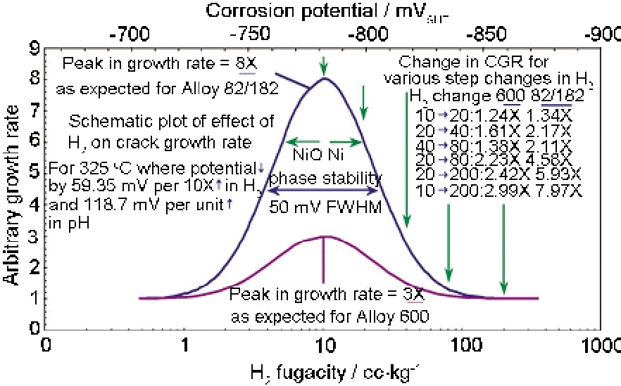 Andresen等[53]指出对于镍基合金,试样SCC裂纹扩展速率随溶解氢含量增加会出现一个峰值。因为,当改变溶解氢含量时,材料腐蚀电化学电位值将产生很大变化,如Ni-H2O Pourbaix图 (图6) 所示,当溶解氢含量使电位接近发生Ni/NiO转变的对应电位时,镍基合金处于不稳定状态,裂纹扩展速率增大,较高或较低的溶解氢含量都将降低裂纹扩展速率。通过大量实验数据总结得来的氢溶解度和裂纹扩展速率的关系如图7所示,其中182/82焊接合金裂纹扩展速率峰值和最小值可以相差近8倍。在PWR实际运行条件下,材料应当处在Ni/NiO相界金属Ni一侧。为了减小材料的SCC,最好的选择就是加大或降低溶解氢含量,使腐蚀电化学电位偏离发生Ni/NiO转变的对应电位。