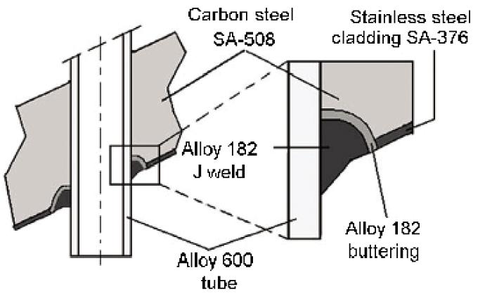核电站核岛内的大型容器,如反应堆压力容器、蒸汽发生器和稳压器等设备的壳体一般由价格低廉的低合金钢制成,而和该容器连接的各种管道大多为耐应力腐蚀开裂 (SCC) 性能好的奥氏体不锈钢,两者一般需要通过镍基合金 (如182/82合金) 焊接在一起,即为异种金属焊接。主要焊接形式有两种:对接焊[2](图1) 和J型坡口焊接[3] (图2)。异种金属焊接在轻水堆核电站中的分布[3]如图3所示。