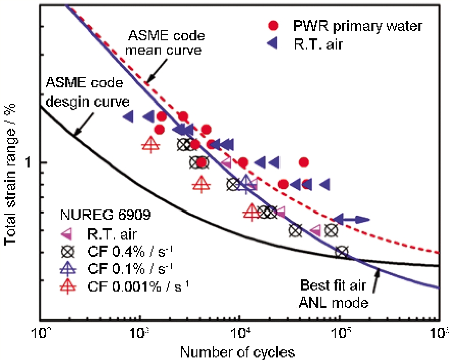 腐蚀疲劳是金属材料在腐蚀介质中承受循环载荷的作用,由腐蚀介质与交变应力协同作用而发生的断裂失效。核电运行经验表明,腐蚀疲劳是核电承压部件的一种重要的潜在失效形式[1]-[3],在核电站的设计、安全分析和运行及老化管理等方面越来越多的被人们关注。目前,反应堆核安全相关设备根据美国机械工程师学会 (ASME) 《锅炉及压力容器规范》第III卷第1册附录I给出的材料设计疲劳曲线进行分析。该曲线已广泛应用于世界各国的核电站部件压力边界材料的疲劳分析。ASME规范所采用的设计疲劳曲线是以材料在室温大气中的低周疲劳实验数据的最佳拟合曲线为基础,将循环次数因子减小20,应力因子减小2.0,并取其中的最小值而得来。其中因子20考虑了数据的分散度 (因子2)、试样尺寸 (因子2.5)、表面状态 (因子4) 等影响因素,但各种影响因素中未充分包括环境介质对金属材料抗疲劳性能的影响。近年来的研究[4]-[6]表明,轻水堆的服役环境对材料的疲劳寿命会产生一定影响,导致ASME 疲劳设计曲线可能存在安全裕度不足。为此,2007年美国核管会 (NRC) 颁布了R.G.1.207导则[7],明确要求新建轻水堆核电厂金属部件的疲劳分析应考虑环境效应对金属材料疲劳性能的影响。
