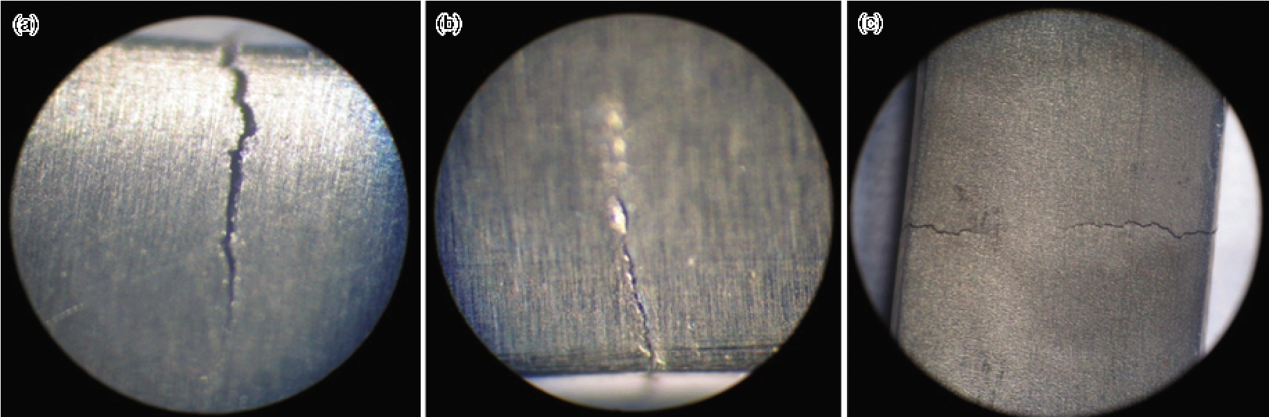 图5为690合金传热管在室温空气、325 ℃高温空气和模拟压水堆一回路高温高压水环境中应变速率为0.1%s-1时疲劳测试后样品标距段表面的宏观裂纹形貌。结果表明,不同环境介质中690合金传热管的疲劳裂纹呈现类似的特征:疲劳主裂纹均在扁舟状样品的标距段出现,有些条件下观察到两条明显的主裂纹,分别从扁舟状样品两侧边起始,向中间扩展;有些条件下仅出现一条主裂纹。主裂纹的多少与应变幅大小无关。主裂纹宏观垂直于加载轴方向,微观上呈锯齿状波动。相对而言,高温高压水中的疲劳裂纹锯齿状波动程度更加明显。