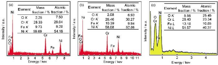 Fig.8 EDS analysis of fatigue fracture surface of 690TT tube in air at room temperature (a), air at 325 ℃ (b) and simulated PWR environment (c)