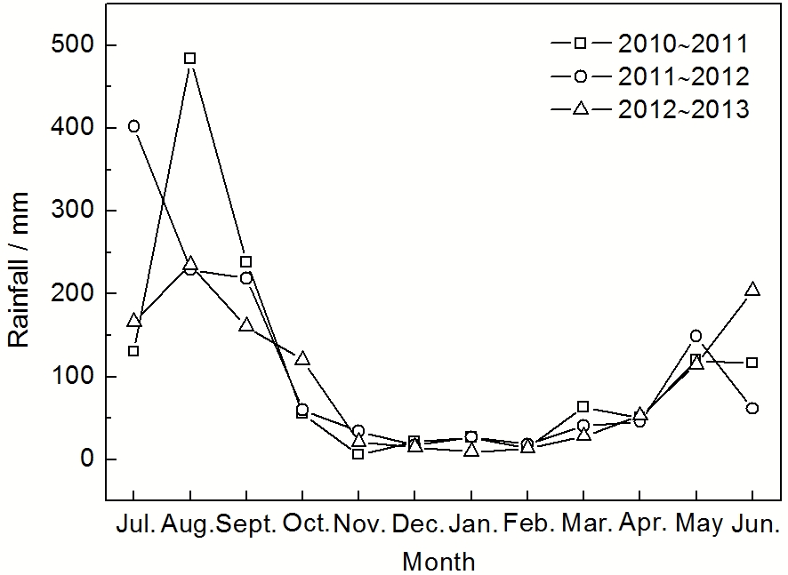 实验周期内,都江堰市每月的降雨情况如图1所示。可见,都江堰市年度降雨情况相近,降雨量在7、8月份达到最大,在11月到次年2月份的降雨量最小,每年5~9月份的降雨量均在100 mm左右,年降雨量在1100 mm以上,雨水充沛。