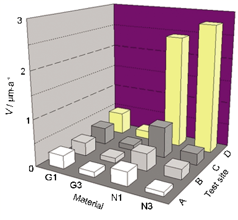腐蚀后的试样,根据标准ASTM G1-03清除腐蚀产物后,计算的腐蚀失重速率见表3。需要特别说明的是该腐蚀速率没有经过空白校正。不同材料在各监测点的腐蚀速率见图5。