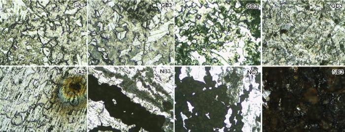 图4给出了3年期试样的金相显微图。从中可见,试样均发生了腐蚀,即使在数码照片中表面完好的镀锌钢试样,在金相图中也出现了许多腐蚀孔,而碳钢试样腐蚀更为严重,除吊顶处的试样外,其他几个监测点试样的表面全部发生了较严重的腐蚀,腐蚀形态为点腐蚀和线状腐蚀,后扩展为全面腐蚀。