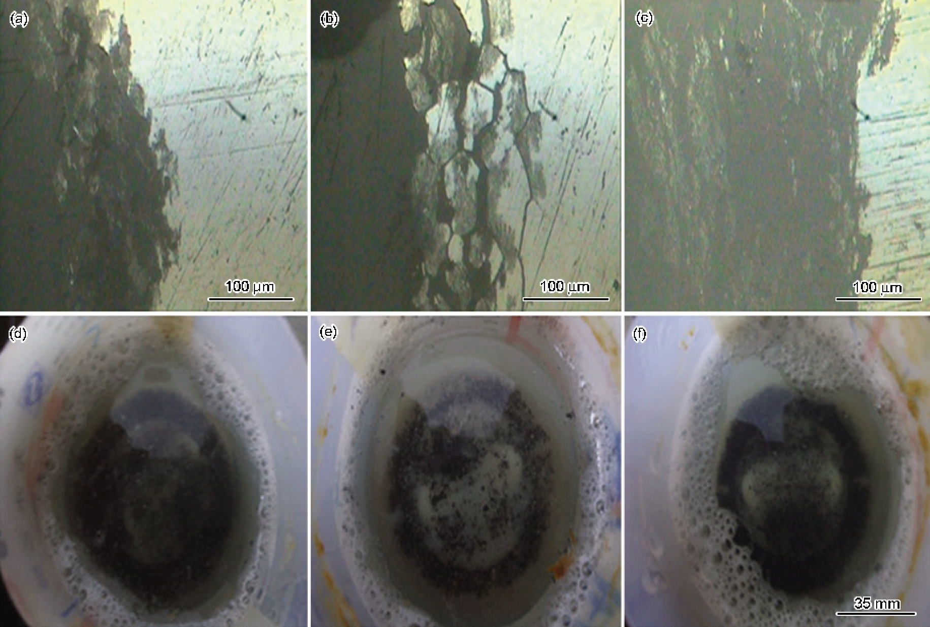 Fig.3 Cross-sections (a~c) and exfoliation products (d~f) of the alloys with 0% (a, d), 0.2% (b, e) and 0.4% (c, f) Yb after exfoliation corrosion test