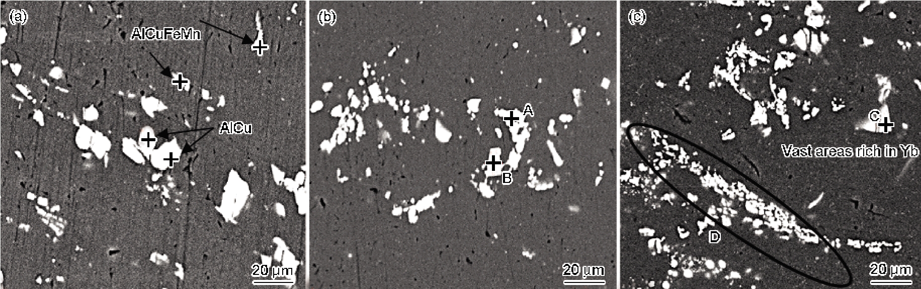 对不同Yb含量合金内典型第二相粒子进行EDS分析,结果见图5和表4。从图5a可知,在不添加Yb的情况下,合金中粗大第二相粒子以AlCu和AlCuFeMn相为主。从图5b和表4中A点与B点的EDS分析结果可知,当Yb含量为0.2%时,由于Yb与Al,Cu,Fe,Mn发生作用,形成含Yb第二相,使得合金中AlCu及AlCuFeMn相减少。由图5c及表4中C点和D点的分析结果可知,当Yb含量增加至0.4%时,合金出现大量偏聚的粗大含Yb第二相。