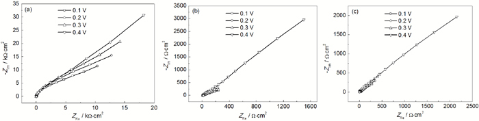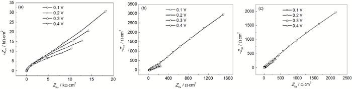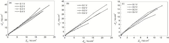 Fig.5 Nyquist plots of the passive films formed at different potentials in the solutions containing Cl- of 0.001 molL-1 (a), 0.003 molL-1 (b) and 0.005 molL-1 (c)