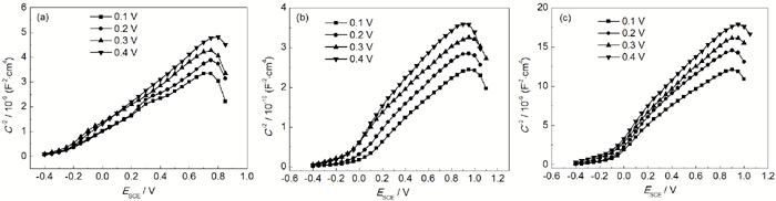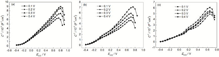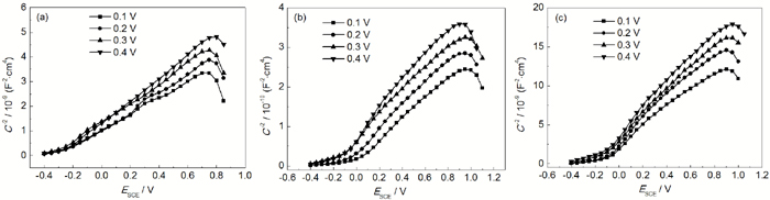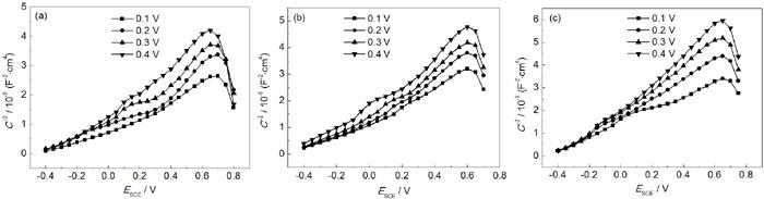 Mott-Schottky曲线测试频率为1000 Hz,激励信号为5 mV,电位扫描区间-0.20~+0.80 V,直流步长为50 mV。