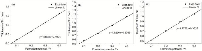 表4 不同条件下钝化膜厚度与成膜电位之间的拟合曲线