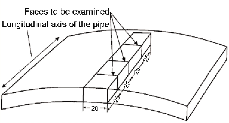 H2S腐蚀实验分别参照NACE TM 0284-2003 和NACE TM 0177-2005标准,用于氢致开裂 (HIC) 测定的试样尺寸为:20 mm×100 mm×t(mm),t为钢板厚度。实验条件为在充有饱和H2S的0.5%CH3COOH+5%NaCl+94.5%蒸馏水溶液中分别浸泡96和288 h,试样取向和实验后试样的截取与被检查面如图1所示。实验开始前,首先用N2除氧2 h,然后通入饱和H2S气体,之后每24 h补充H2S气体一次。实验结束后确定HIC评定参数:裂纹长度率 (CLR)、裂纹厚度率 (CTR) 和裂纹敏感率 (CSR)。为了便于比较,对两种钢分别进行了两组HIC实验,方案I为标准实验,初始pH值为2.7,浸泡96 h后的终止pH值为3.2;方案II为严苛实验,初始pH值为1.9,浸泡288 h后的终止pH值为3.0。