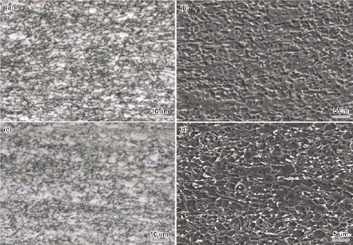 Fig.3 OM (a, c) and SEM (b, d) images of A steel (a, b) and B steel (c, d)