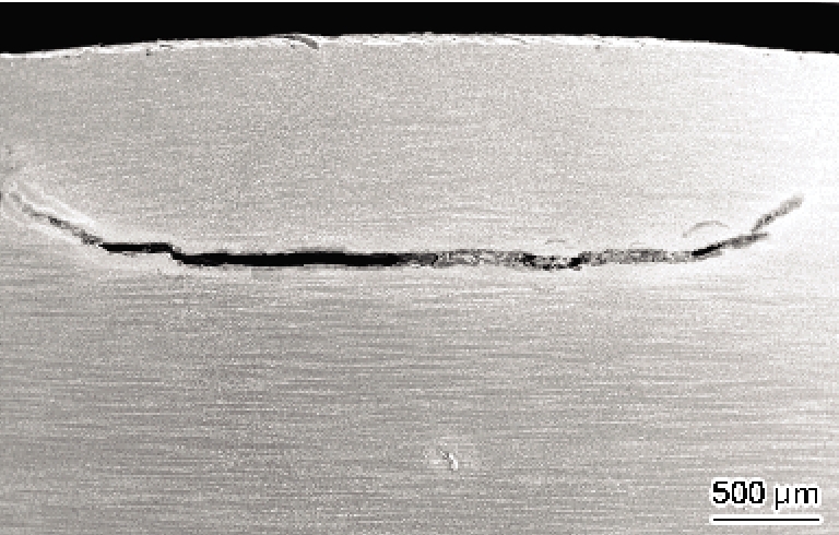 图4为两组实验条件下的HIC表面腐蚀形貌。显然,A钢在标准实验与严苛实验条件下的表面腐蚀形貌平整,未发现明显的腐蚀产物及氢鼓泡;B钢出现明显的氢鼓泡,而且随着实验条件的加剧,氢鼓泡尺寸变大,数量增多。利用氢压理论[13]能很好地解释钢表面的氢鼓泡现象,即H扩散进入钢内部的微观缺陷处,结合成的H2所产生的高压将会导致裂纹的形核和扩展。与此同时,氢压建立起来的局部应力梯度会加速H的进一步富集。当钢中的局部内氢压达到钢的断裂强度时,就会导致氢致裂纹的形核和扩展。当然,只有当进入钢中的局部氢浓度c0远大于临界氢浓度cth时,才能使缺陷处的H2压力超过临界值,从而产生HIC。如裂纹接近表面,则当它平行表面扩展时,巨大的氢压就会使表层产生鼓泡,而且在鼓泡下方往往存在氢致裂纹 (见图5)。显然进入钢中的c0与H2S分压、溶液的pH值以及浸泡时间有关,这在本文的实验结果上得到了很好的反映。实验方案II的实验条件不仅溶液的pH值低,而且浸泡时间长,从而其氢鼓泡密度更大。表4中裂纹厚度率明显升高这一趋势也间接证明这一结果。