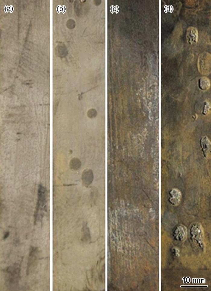 Fig.4 Surface photographs of two experimental steels immersed in NACE TM0284 solution: (a) Steel A, pH=2.7 (oh), 3.2 (96 h); (b) Steel B, pH=2.7 (oh), 3.2 (96 h); (c) Steel A, pH=1.9 (oh), 3.0 (288 h); (d) Steel B, pH=1.9 (oh), 3.0 (288 h)