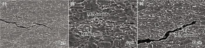 图6为两种钢氢致裂纹的扩展路径。具有较小尺寸M/A组元的A钢在腐蚀288 h后仅出现一条微小裂纹 (图6a),可以看到其裂纹扩展路径曲折,表现出优异的抗氢致开裂性能。B钢由于其M/A组元尺寸较大,氢致开裂主要沿着M/A组元与基体界面扩展 (图6b和c)。