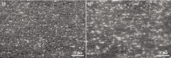 一般认为,管线钢在连续冷却转变为AF的过程中,C会逐渐向残余奥氏体与已转变的铁素体相界面扩散、富集。在一定冷速下,相比马氏体,AF相变温度高,相变驱动力小,相变很难进行到底。由于C沿晶界扩散较快的原因,少量奥氏体便以岛状沿晶界残留下来。在随后的冷却过程中,对于管线钢成分而言,富碳奥氏体不可能保留至室温,大部分将转变为马氏体,残余的奥氏体和转变的马氏体共存,即形成M/A组元,在SEM下呈均匀亮白色,并且有突起感 (见图3)。Wang等[10]利用透射电镜研究了X70管线钢中的M/A组元,结果表明,M/A组元的形成与TMCP工艺过程中的相变有关,随后的冷却速率对小岛的数量、大小、形态和分布具有重要影响。适当的快冷 (15 ℃/s最佳) 可以减少C向残余奥氏体中的扩散,从而减小岛状物的相对量,并使其细小且弥散地分布于基体中。另外,随着冷速的提高,M/A组元的形态由不规则的棒状向薄片状转变,可表现出对裂纹扩展的阻滞作用。在本文中,A钢与B钢的TMCP轧制工艺以及随后的冷却速率不同,是造成M/A组元尺寸存在差异的主要原因。相比B钢,A钢的终轧温度较高,这就使得A钢在终轧与快冷时间内不发生相变,从而减轻了M/A组元形成倾向。因此,从TMCP工艺方面考虑,在保证强度的同时,适当提高终轧温度并优化冷却速率对M/A组元的控制具有积极的影响。从化学成分的角度考虑,降低C含量也是避免出现大尺寸M/A组元的一个有效途径。但是对于高强度管线钢来说,C是重要的强化元素,C的含量不能大幅降低。同时,适量添加抑制C扩散的强碳氮化物形成元素,如Nb,V和Ti等,可有效减少M/A组元的形成。而且Nb,V和Ti的碳氮化物可成为强烈的不可逆氢陷阱,对提高抗H2S腐蚀性能具有积极作用[19]。