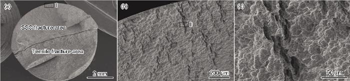 Fig.9 Fractographs of SSC fracture at 90%σs loading for Steel B: (a) macrograph of the fracture surface, (b) a higher magnification of area I in Fig.9a, (c) a higher magnification of area II in Fig.9b